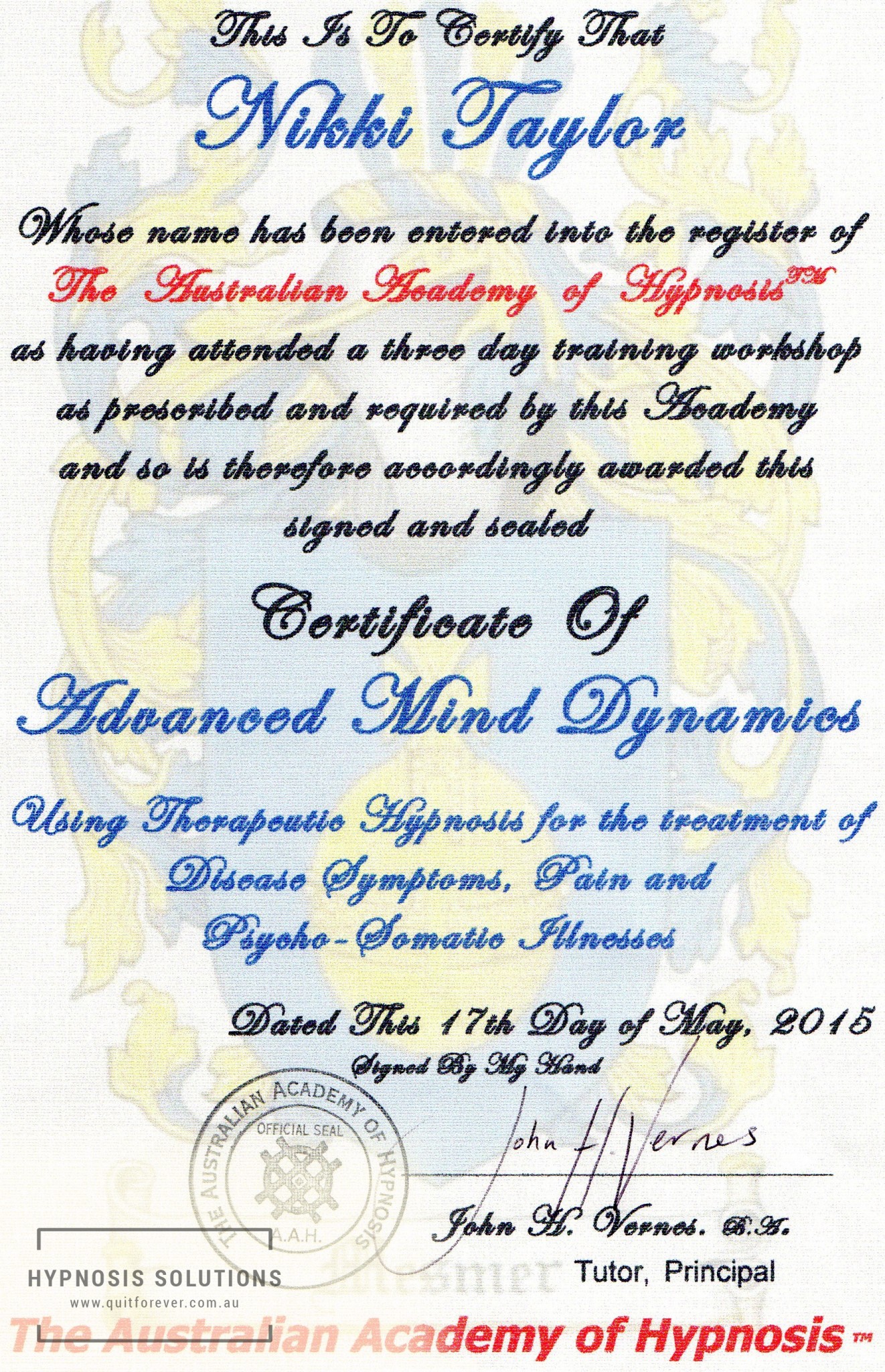 Certificate of “Advanced Mind Dynamics”