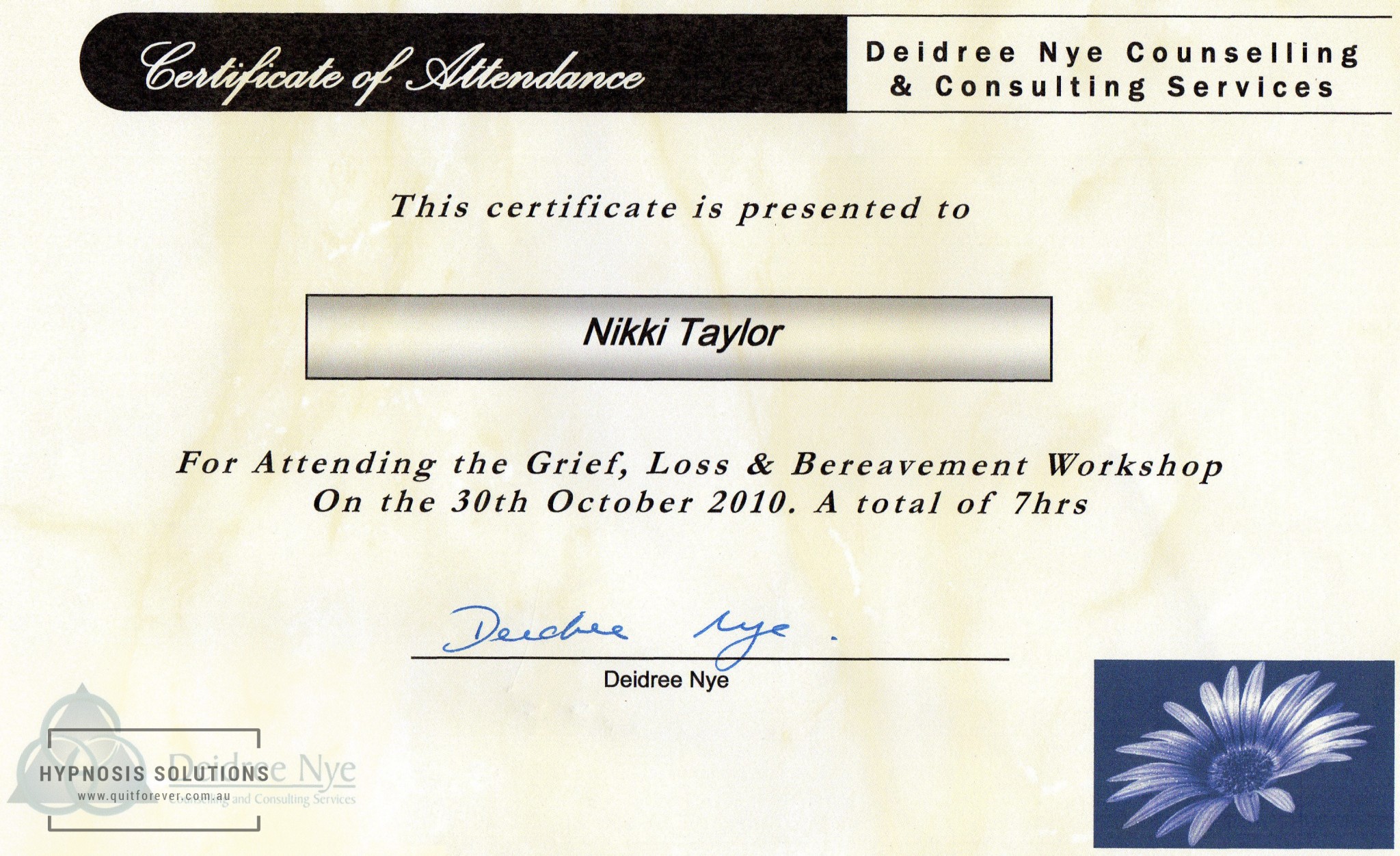 Certificate of Attendance, “Grief, Loss & Bereavement Workshop”